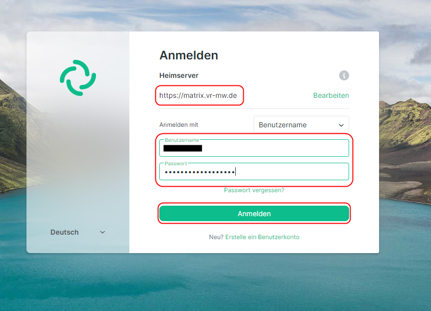 Zuerst Loggen Sie sich ein, indem Sie auf die "Anmelden" Schaltfläche drücken. Daraufhin werden Sie nach Login-Daten gefragt. Hier ändern Sie bitte den Server, welcher für die Anmeldung genutzt wird von "matrix.org" zu "matrix.vr-mw.de", wie in Bild 1 und 2 Beschrieben ist.. Danach geben Sie Ihre Login-Daten ein. Ihr Benutzername besteht aus
