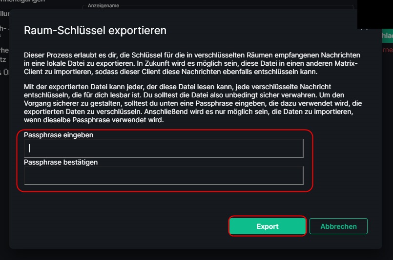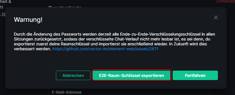 Wenn Sie das Kennwort ändern, werden Sie aufgefordert einen E2E-Schlüssel zu exportieren. Dieser braucht auch eine sogenannte "Passphrase".